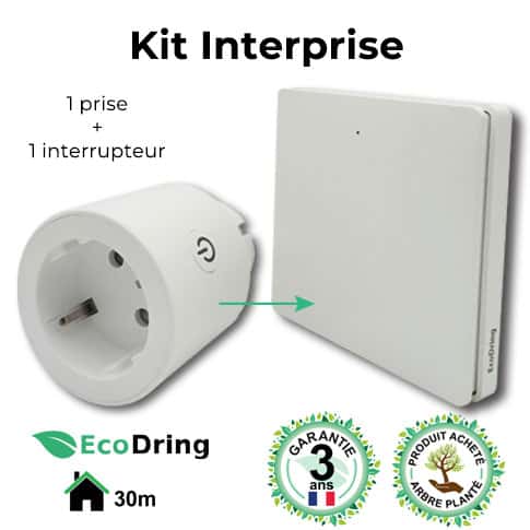 Le kit Interprise est composé de la prise commandée secteur et du bouton associé qui peut être utilisé partout dans votre maison ou collé au mur de votre choix.Ce kit est très pratique car il permet de contrôler à distance dans votre maison tout objet branché.